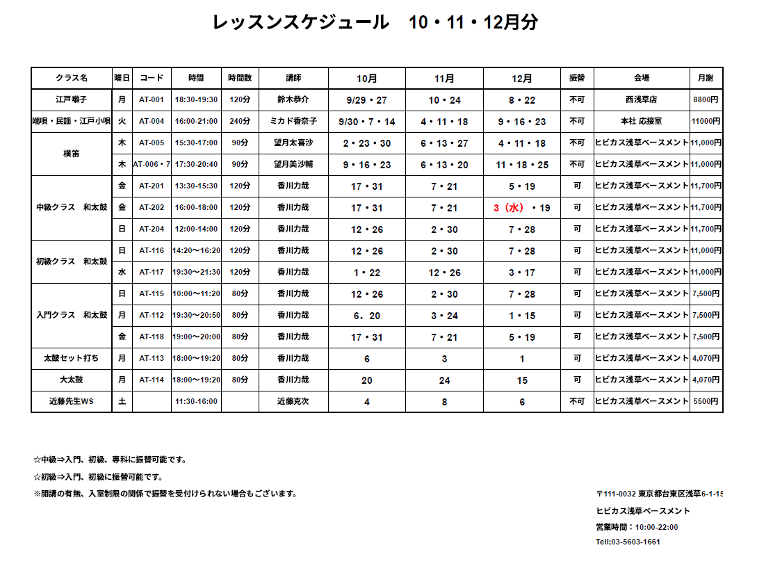 ヒビカス浅草ベースメント 2025年10~12月のレッスンスケジュールを更新しました。