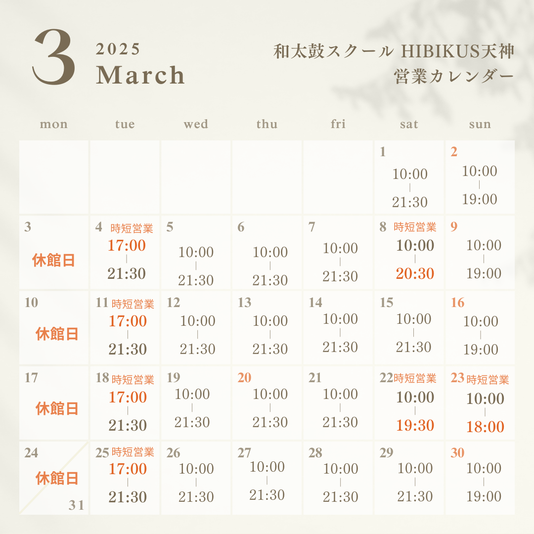 【2025年3月 ヒビカス天神 営業カレンダー】